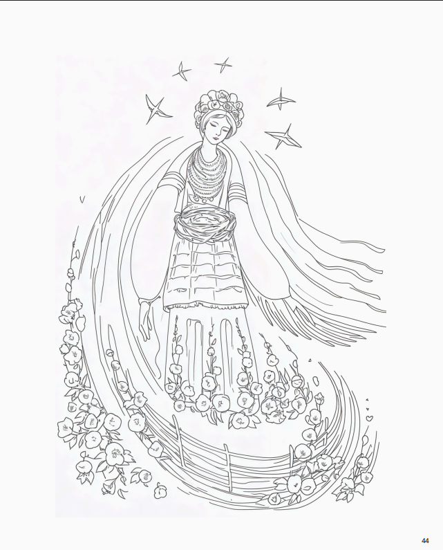 — це маленька історія про жіночу енергію, материнство, мудрість і красу. Розфарбовуючи малюнки, ви поринаєте у стан спокою, відпускаєте щоденні турботи та відновлюєте внутрішній баланс. Ця розмальовка підходить для тих, хто шукає момент тиші, хоче зануритися в атмосферу релаксу та з’єднатися з власною душею через кольори.
